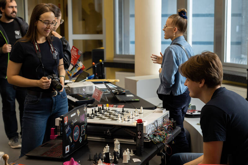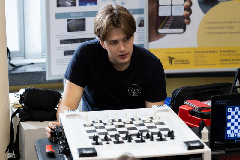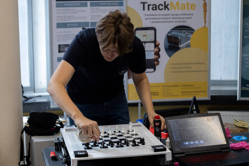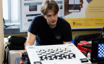 – W każdej figurze mamy magnes, który od dołu jest ciągnięty przez elektromagnes jeżdżący pod planszą – tłumaczy Wiktor Jankowski-Ostrowski, członek KN Algo.