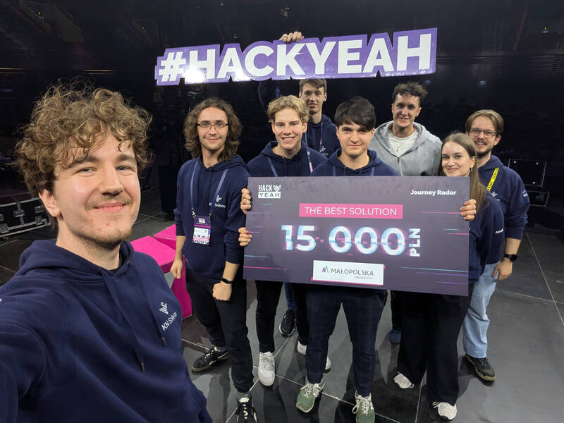 The Solvro club entered the competition with as many as three teams, and the "Solvrownicy w Piaskownicy" (“Solvroxes in SandBoxes”) team won the main prize of 15,000 PLN in the Journey Radar category, where the key task was to develop a system for reporting delays and disruptions in public transport.